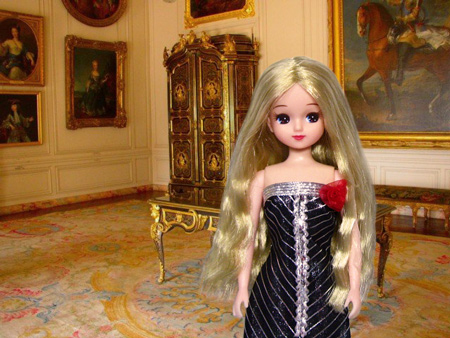 スーパーウェディングリカちゃん@2009AWパーティ黒銀斜め縞ロングドレス 黒と金のタンスとテーブル・フランス・ベルサイユ宮殿