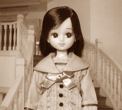 女子美リカちゃん キャッスル色替え制服セーラー服 茶色の階段と白い手すり・洋館 セピア
