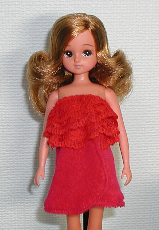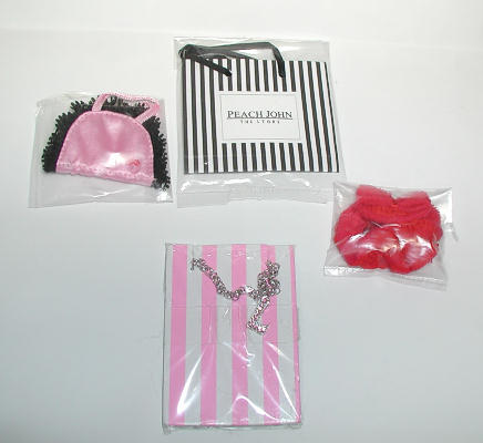 こちらは付属品。赤いものはヘアターバン。ピンクのバッグはランジェリーポーチ。「L」型のアンクレットは人間サイズです。