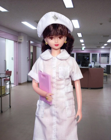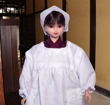 で、ごまかすためにオカンスタイル(笑)。着物はハンドメイド通販、割烹着はノアドロームの型紙で作りました。