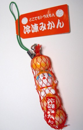 お土産にもらった根付け「どこでもドラえもん 冷凍みかん」でした。