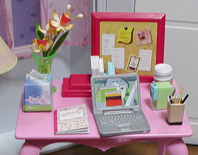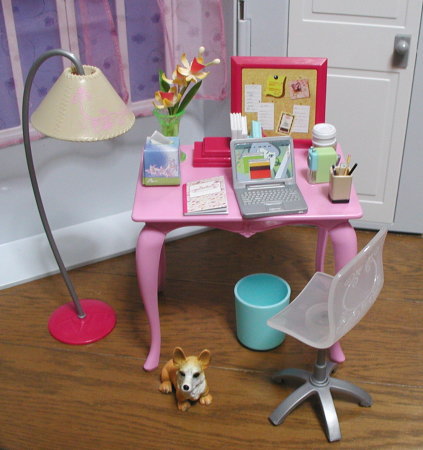 「わんちゃんと勉強机セット」を買ってきました。机の脚と電気スタンドのシェードは取り外し可能です。背景:バービーのすてきなおうち 小物がたくさん♪ パソコンは開いたまま固定できます。