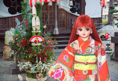 新年2019 教室リカちゃん(赤髪)@手鞠柄オレンジ着物・振袖新貝天満社・神社・新年・初詣