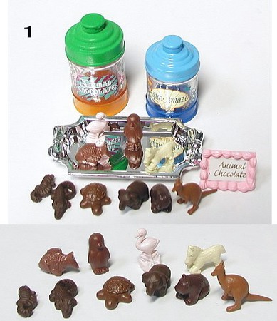 緑のビンには「Animal chocolates」、青のビンには「Aqua-Amaze」と書いてあります。