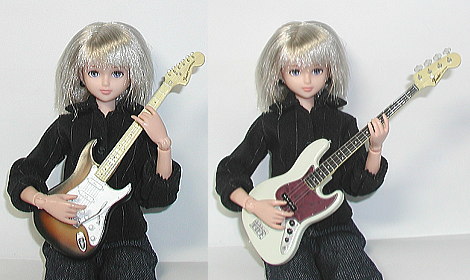 (クリックで大きく表示されます) ストラトキャスターは27cmドールには若干小さめですね。(リカちゃんにぴったりかも)ジャズベースの方はいい感じです。