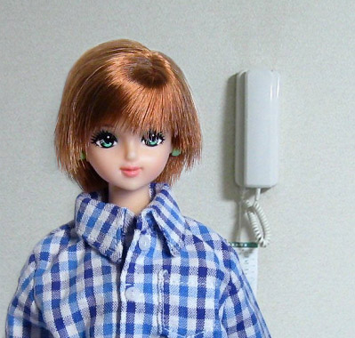 アキラ@アゾンメンズ半袖シャツ(ブルーチェック) 水色チェックシャツ インターホン