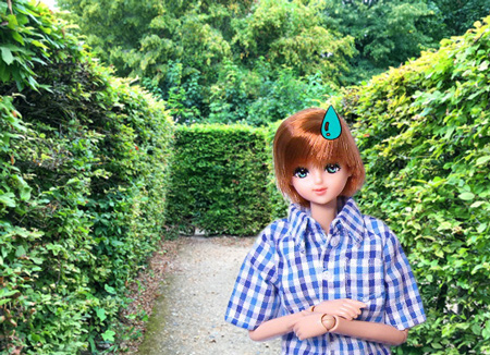 アキラ@アゾンメンズ半袖シャツ(ブルーチェック) 水色チェックシャツ 汗  生垣の迷路・フランス・パリ・庭園・公園・緑