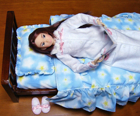 ガウンとスリッパは「おやすみさくらんぼ」、ベッドと寝具はアゾンの物です。